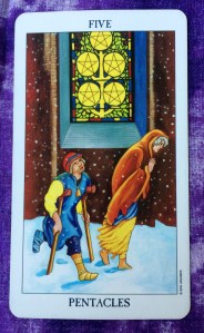 Hello, everyone. The Tarot card of the day is the Five of Pentacles. Like the card for this past weekend, the Five of Pentacles is showing that there may be more to our situation than meets the eye. As a whole, we all are dealing with challenges and difficulties. The key is to realize that you are not alone. You even may have people in your life who are willing to help you. Don’t hesitate to ask for help if you need it. Also, look around: The help you need may be right in front of you.