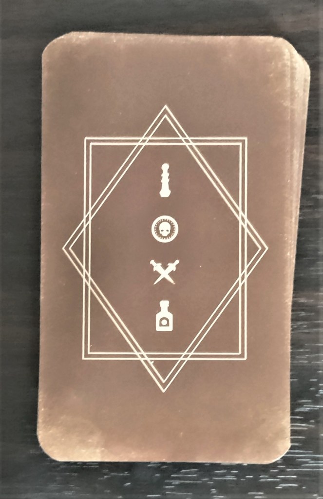 The cards themselves are sturdy, have a matte finish, and are easy to shuffle. The backs of the cards are simple, showing the four suits—Rods (Wands), Coins (Pentacles), Blades (Swords), and Elixirs (Cups). The front of the cards have an old textbook-like, tan background, with fantastical images and bright colors that are interesting and lively.