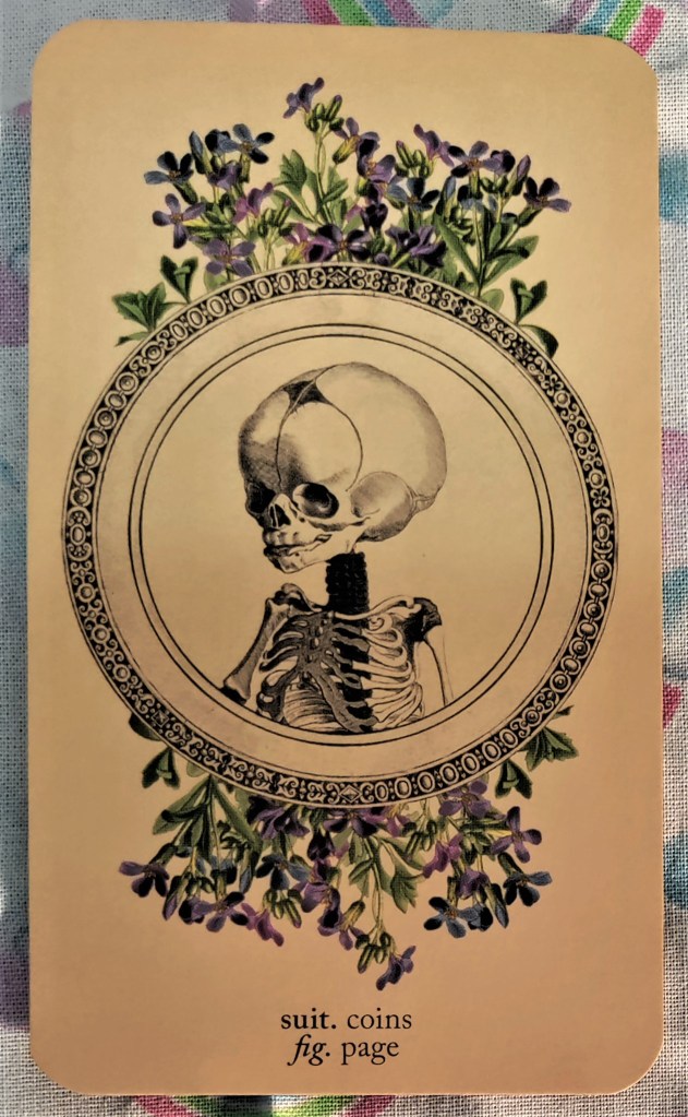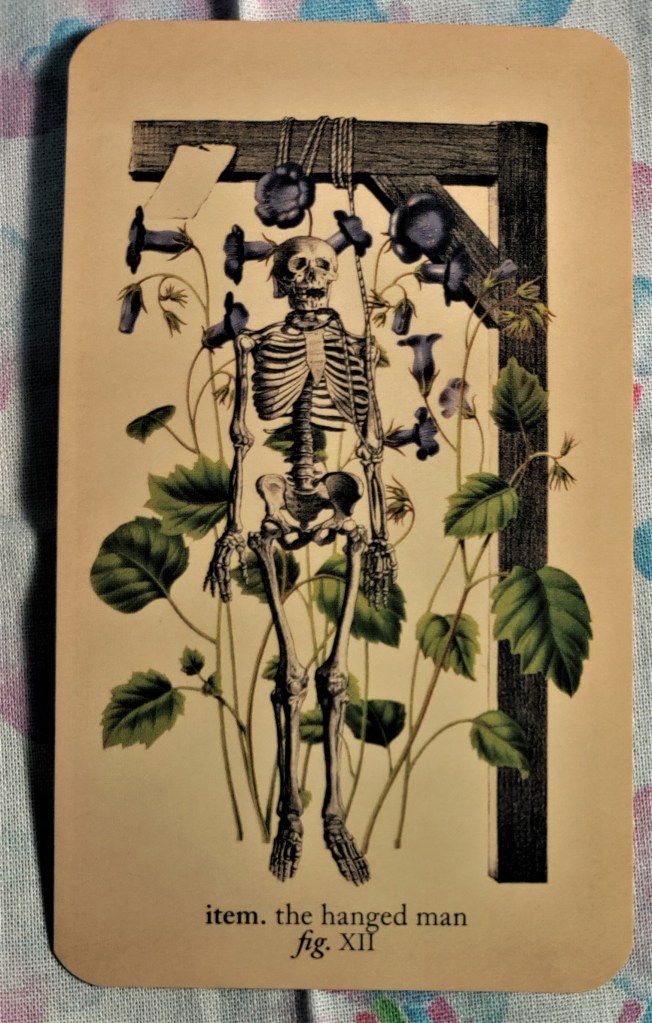 Some of my favorite cards from the Antique Anatomy Tarot are the Pages, whose skulls are clearly that of an infant (the skulls are not fused and you can clearly see the fontanelle). The Emperor and Empress are interesting in that they are almost identical images except that in the thigh area, one appears to be more “masculine” and the other more “feminine” than that other, and one appears to show more muscle and the other more bone. The Hanged Man, shows a full skeleton that is not upside down and unlike in the RWS, appears to have been hanged as a criminal.