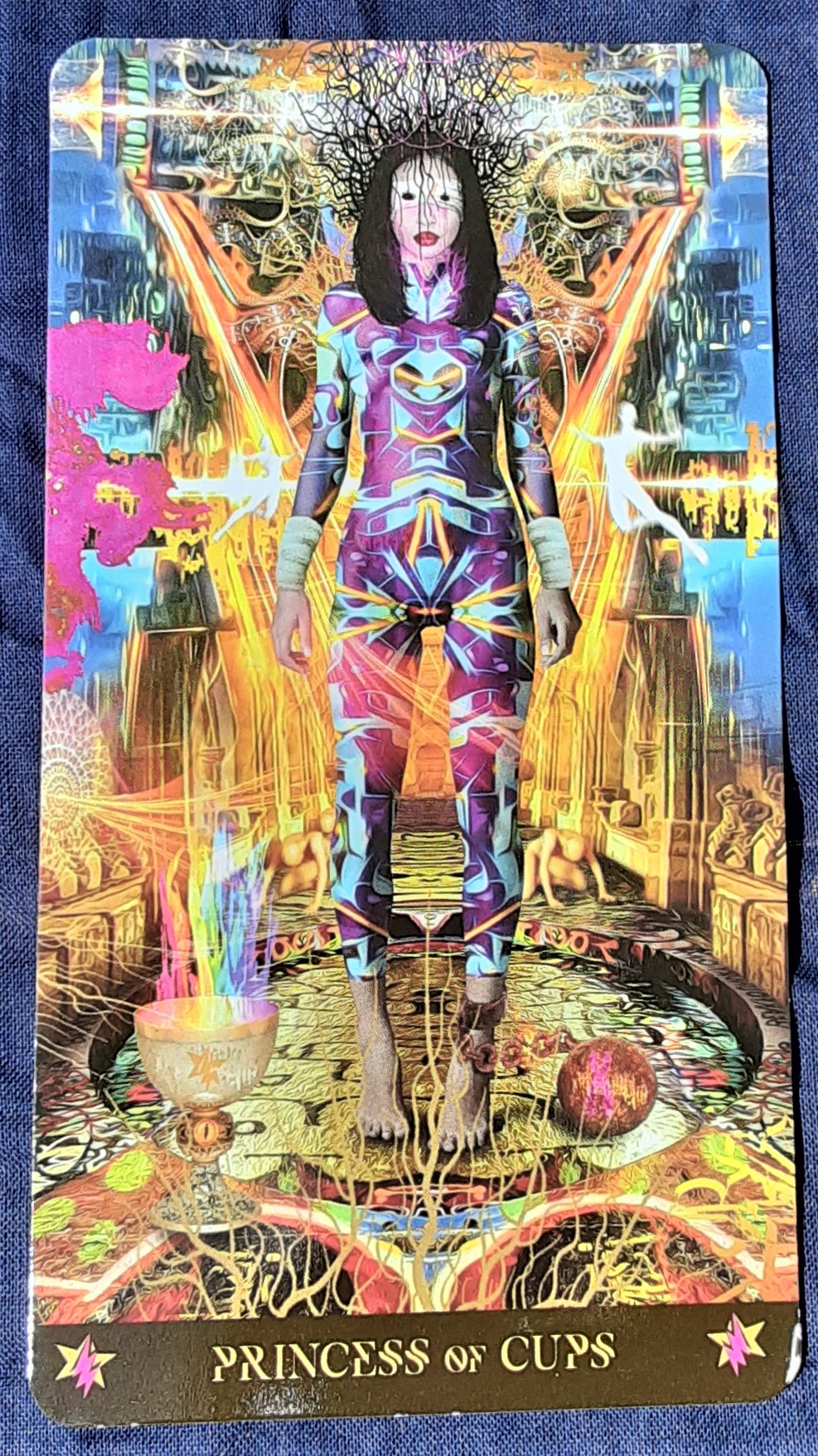 The Princess (Page) of Cups at its purest is a sweet, sensitive soul. They like to have fun and they have a vivid imagination. It is their superpower. This image is from the Starman Tarot.